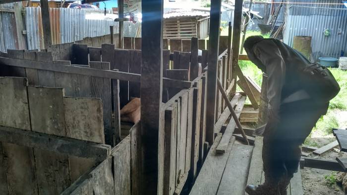 Satgas Binmas Noken Polres Paniai, Aipda Lukas Payung dan Brigpol Agus, melakukan pengecekan kebersihan kandang dan ternak babi, pada Jum’at, 01 Maret 2019 pukul 14.30 wit s/d 15.30 wit bertempat di spot kandang babi kampung Madi.