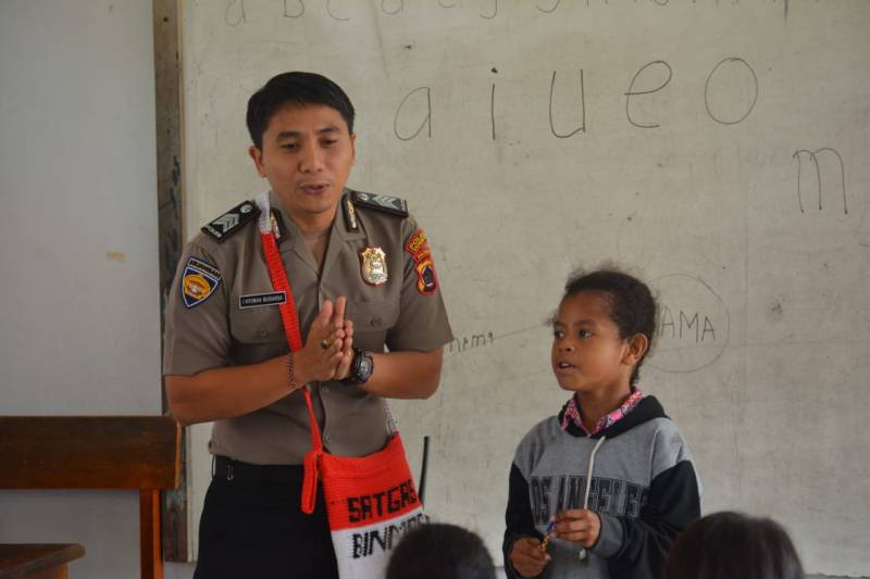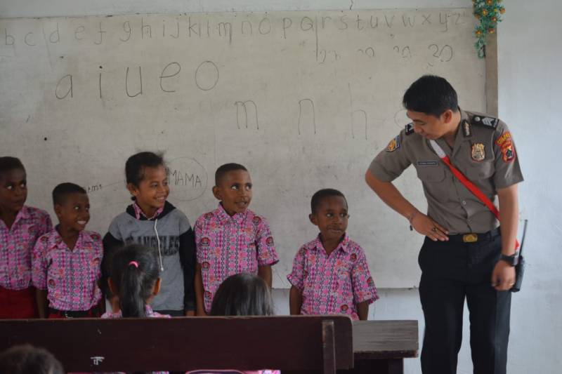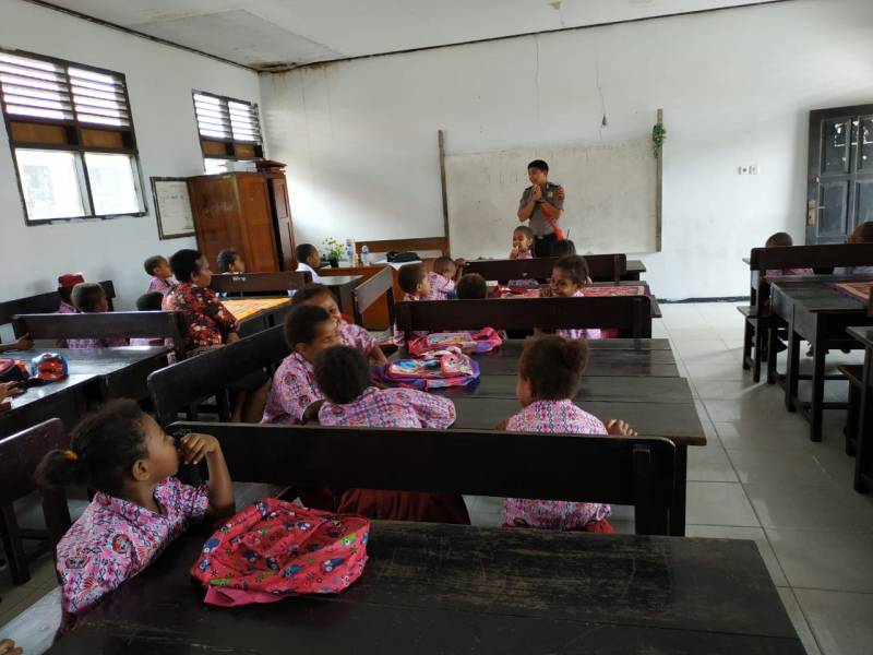 Yahukimo – Anggota Satgas Binmas Noken Polres Yahukimo melaksanakan kegiatan Polisi Pi Ajar Sekolah di SD N 1 Dekai. Kamis (25/07/2019)