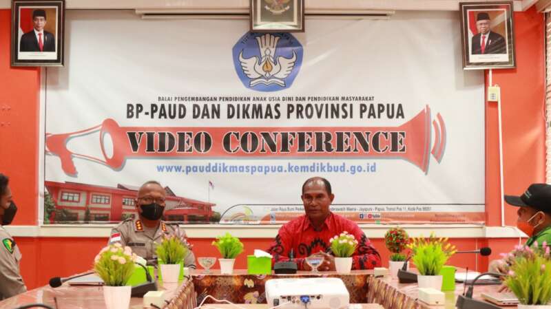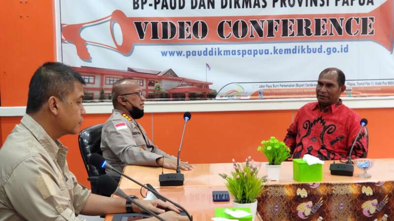 Jayapura | Di ruang Video Conference Balai Pelatihan Pendidikan anak Usia dini dan Pendidikan Kemasyarakatan Papua Satgas Binmas Ops Damai Cartenz-2022 audiensi dalam rangka memberikan edukasi tentang mencintai NKRI dan mengenal serta menghargai jiwa nasionalisme kepada anak-anak usia sekolah yang ada di daerah pedalaman di 5 (lima) wilayah operasi yaitu Kabupaten Yahukimo, Kabupaten Puncak Jaya, Kabupaten Intan Jaya, Kabupaten Nduga dan Kabupaten Pegunungan Bintang.(13/04/22)