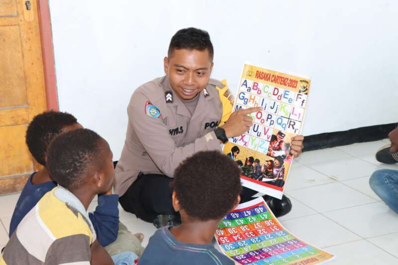 Wamena-Satgas Binmas Noken Ops Rasaka Cartenz 2023 mulai mengenalkan program Si Ipar (Polisi Pi Ajar) kepada anak-anak yang putus sekolah di Kampung Kama, Distrik Wesaput, Jumat (14/04) pagi.