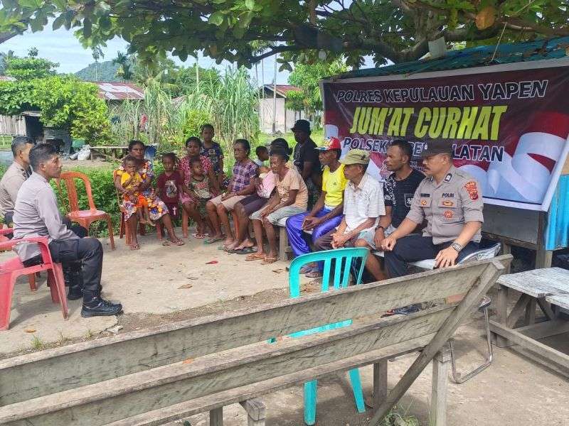 Yapen – Polsek Yapen Selatan saat melakukan kegiatan Jumat curhat bersama warga yang berada di eks terminal pasar warari serui, menerima berbagai keluhan warga yang mana sering terjadinya gangguan Kamtibmas terlebih pada malam hari membuat keresahan warga. Jumat (15/3/24).
