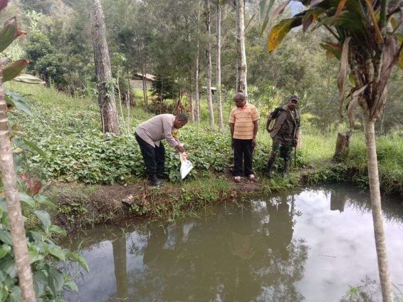 Tiom – Kasat Binmas Polres Lanny Jaya Ipda M. Sawen memberikan pakan ternak ikan kepada masyarakat di dua Desa yang berada di Wilayah Hukum Polres Lanny Jaya guna perkembangan budidaya ikan air tawar, Senin (18/3).