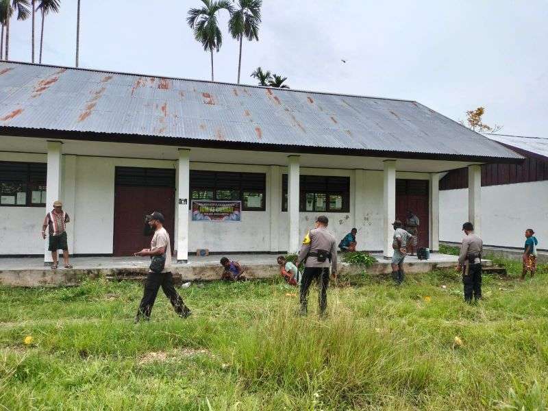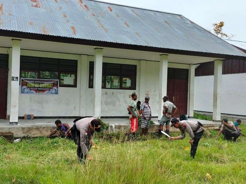 Yapen – Mengambil kegiatan jumat curhat oleh Polsek Angkaisera, bersama masyarakat membersihkan lingkungan pada lokasi gedung baru SMP Negeri Borai Kampung Woniwon Distrik Yawakukat. Jumat (22/3/24).
