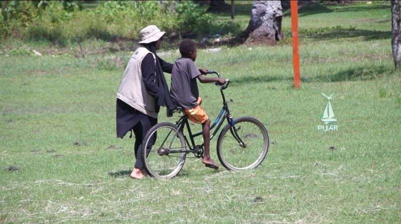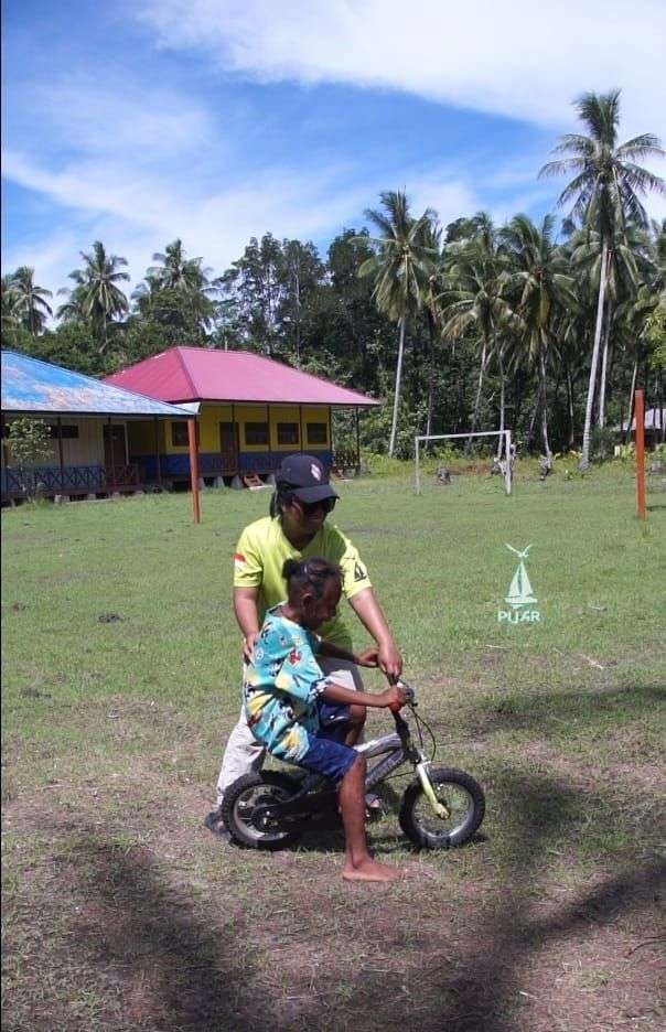 Anak-anak Atuka sangat girang dimana satu persatu kami melatih mereka mengayuh pedal sepeda, ada yang menuju ke kanan dan hampir menabrak temannya hingga temannya berlari dan jadi bahan tertawa temannya, maka kakak pijar membantu.