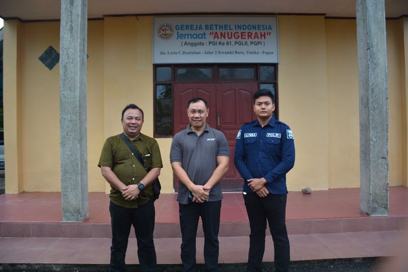 Timika – Menjaga keharmonisan di tengah keberagaman menjadi komitmen bersama antara kepolisian dan tokoh agama di Timika. Wakasatgas Humas ODC-25, Kompol Yusuf Tauziri, S.I.K., bersama personelnya, melakukan silaturahmi dengan Ketua Forum Kerukunan Umat Beragama (FKUB) Kabupaten Timika, Pendeta Dr. Jeffrey C. Hutagalung, MPhil, di kediamannya, Komplek Gereja Bethel Indonesia Jemaat “ANUGERAH”, Kamis (20/2) pagi.