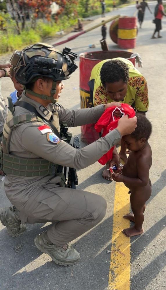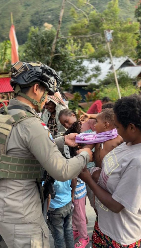Dalam momen yang penuh kehangatan itu, tampak personel Satgas mengenakan pakaian kepada seorang anak kecil, disaksikan oleh warga sekitar. Aksi ini merupakan bagian dari upaya pendekatan humanis Satgas Tindak Operasi Damai Cartenz kepada masyarakat Papua, khususnya di daerah yang masih tergolong sulit dijangkau.
