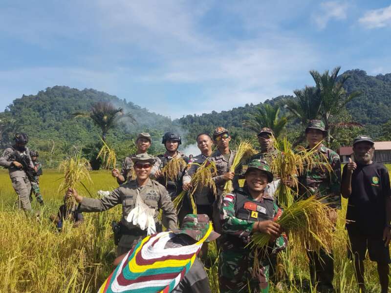 Satgas Preventif Ops Damai Cartenz bersama TNI dan Masyarakat Lakukan Panen Raya Padi Bersama