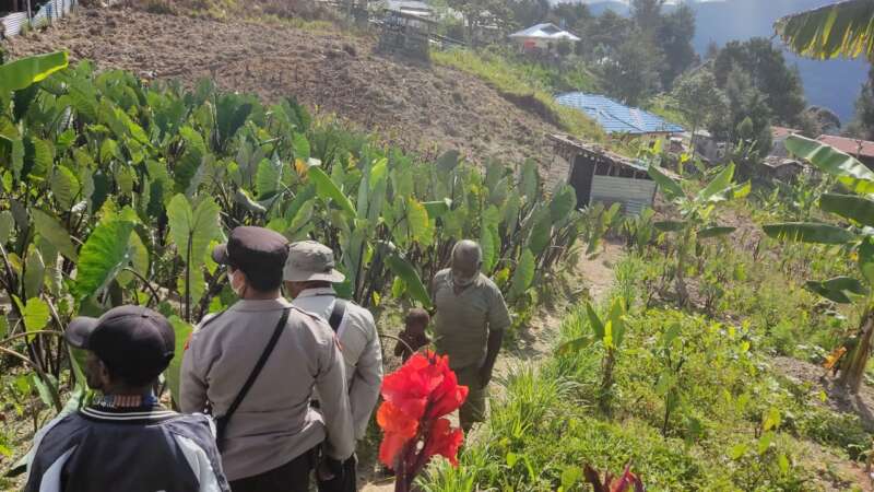 Jaga silaturahmi dengan warga Binaan, Satgasres Binmas Noken Ops Damai Cartenz-2022 kunjungi kebun milik Bapak Stevanus Belau.