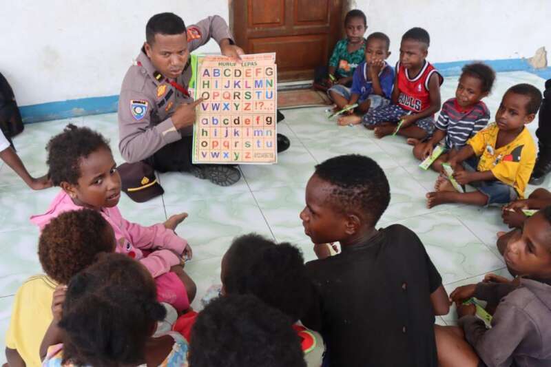 Jadi Guru, Polisi di Yahukimo Ajari Anak-Anak Baca Tulis