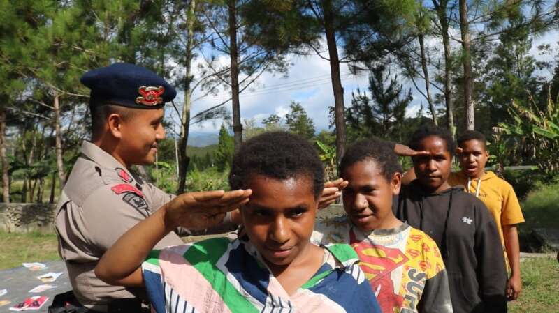 Tingkatkan Rasa Cinta Tanah Air, Binmas Noken bersama Brimob Nusantara Ajarkan Latihan Upacara kepada Anak-anak Kampung Parema